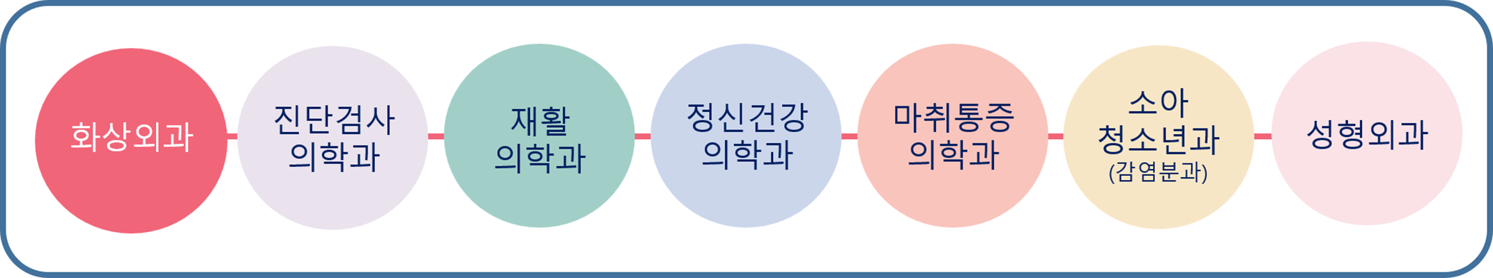 화상 초기부터 일상 회복까지 개별 환자 맞춤형 다학제 통합진료 시스템을 통하여 전문병원으로서의 차별화된 진료를 시행하고 있습니다.
